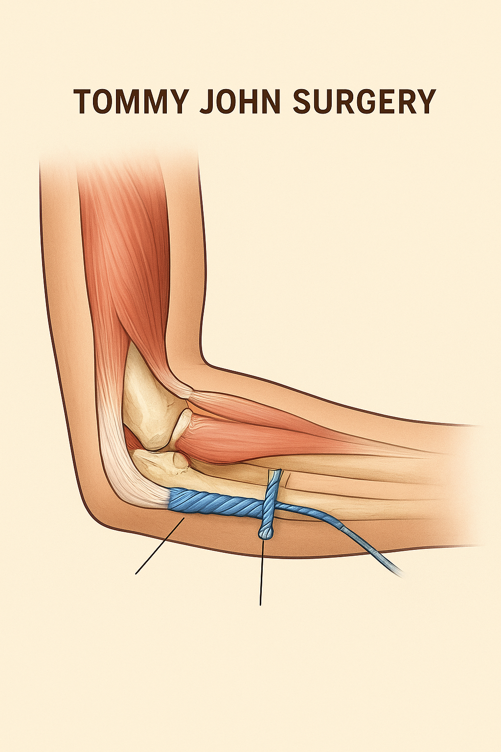주로 야구 선수나 팔꿈치에 과도한 부담이 가해지는 운동선수들에게 많이 시행되는 팔꿈치 인대 재건술로 팔꿈치 내측에 있는 내측 측부 인대(Medial collateral Ligament, MCL)가 손상 되었을 때 치료하는 대표적인 수술법입니다.